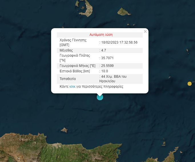 Σεισμός μεγέθους 4,7 βαθμών της κλίμακας Ρίχτερ έγινε σήμερα (18.02.2023) το απόγευμα στην Κρήτη.