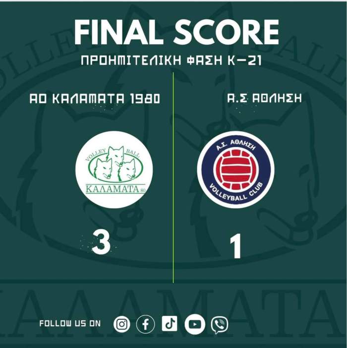 Νίκη με 3-1 σετ πέτυχε η εφηβική ομάδα της Καλαμάτας ’80 επί της Άθλησης για το Πανελλήνιο Πρωτάθλημα Κ21.