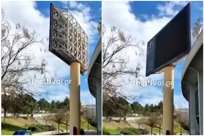 Ανησυχητική εικόνα από το Καυτανζόγλειο, με τον φωτεινό πίνακα του Σταδίου της Θεσσαλονίκης να κάνει… σβούρες, από τον ισχυρό άνεμο.