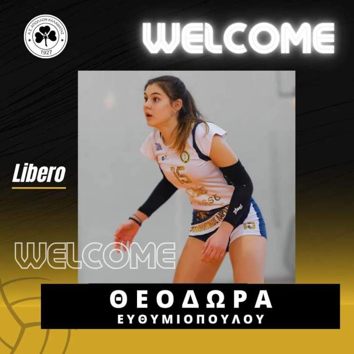Εμπιστοσύνη σε νέα παιδιά και ταλαντούχα με διαθεση για διάκριση δείχνει ο προπονητής μας για αυτό βρίσκεται κοντά μας ή Θεοδώρα (Δωρα) Ευθυμιοπουλου που αγωνίζεται στη θέση του λιμπερο.