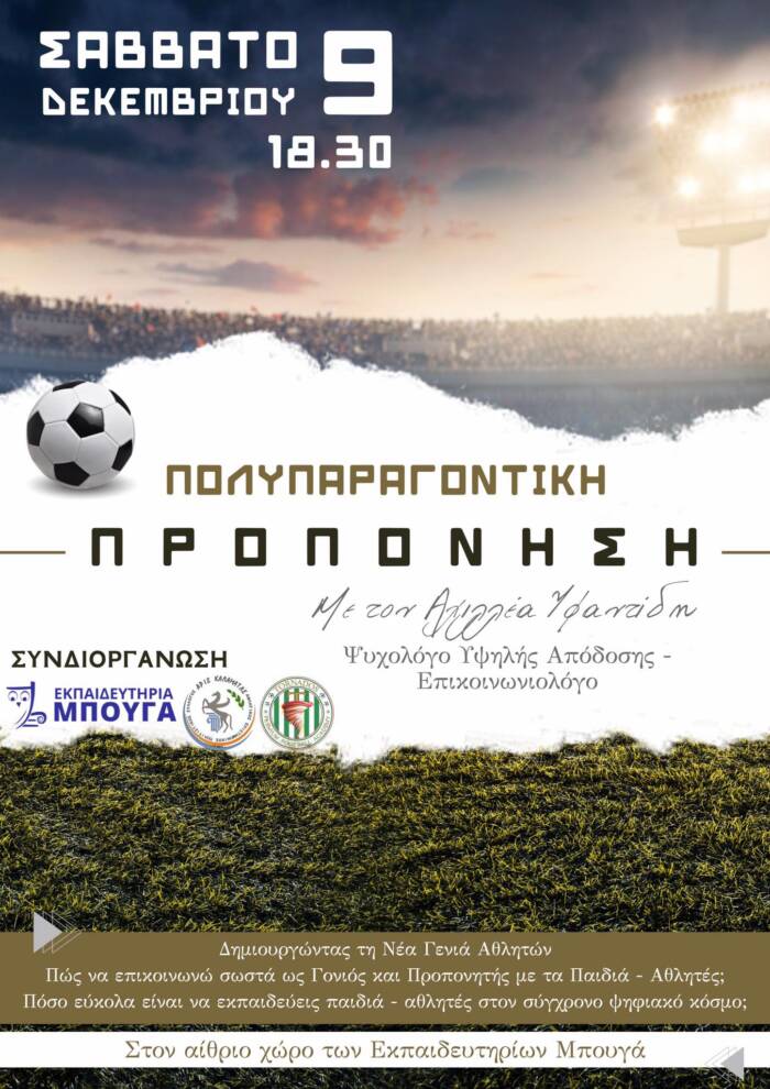 👉 Η εκδήλωση θα διεξαχθεί το Σάββατο 9 Δεκεμβρίου 2023 στο αίθριο των Εκπαιδευτηρίων Μπουγά στις 18:30 και είναι μια συνδιοργάνωση του αθλητικού συλλόγου Α.Ε.Π.Σ. ΑΡΙΣ ΚΑΛΑΜΑΤΑΣ, της Ακαδημίας ποδοσφαίρου TORNADOS P.F.A. και των Εκπαιδευτηρίων Μπουγά.