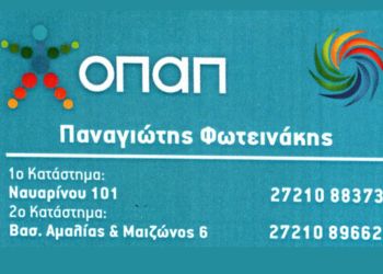 Πρακτορείο ΟΠΑΠ. Παναγιώτης Φωτεινάκης. 1ο κατάστημα Ναυαρίνου 101. 2ο κατάστημα Βασ. Αμαλίας και Μαιζώνος 6