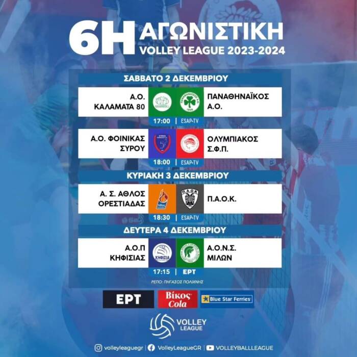Το πρόγραμμα και οι μεταδόσεις της 6ης αγωνιστικής στο πρωτάθλημα Volley League 2023-24: