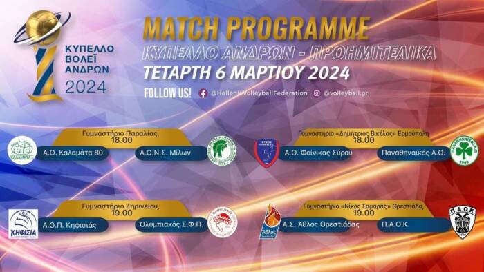 Όλοι οι αγώνες θα διεξαχθούν την Τετάρτη 6 Μαρτίου με το πρώτο σερβίς να δίνεται στις 18:00 σε Καλαμάτα και Ερμούπολη.