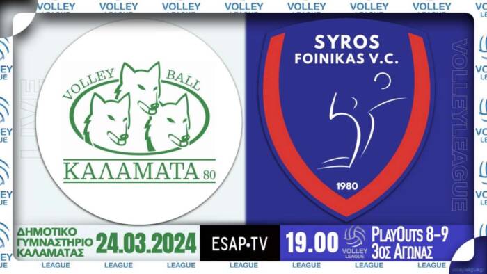 | 24/03/2024: | Volley League | Play Out | Α.Ο.Καλαμάτα 80 – Α.Ο.Φοίνικας Σύρου | |