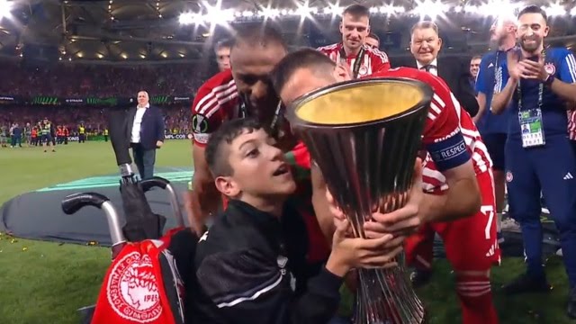 Ο οπαδός του ΠΑΟΚ ήταν επίσημος προσκεκλημένος της ομάδας του Ολυμπιακού και η στιγμή που ο Ελ Κααμπί μαζί με τον Κώστα Φορτούνη πήγαν κοντά του, τον αγκάλιασαν και του έδωσαν να κρατήσει το τρόπαιο, έκανε όλο το γήπεδο να χειροκροτήσει δακρυσμένο.