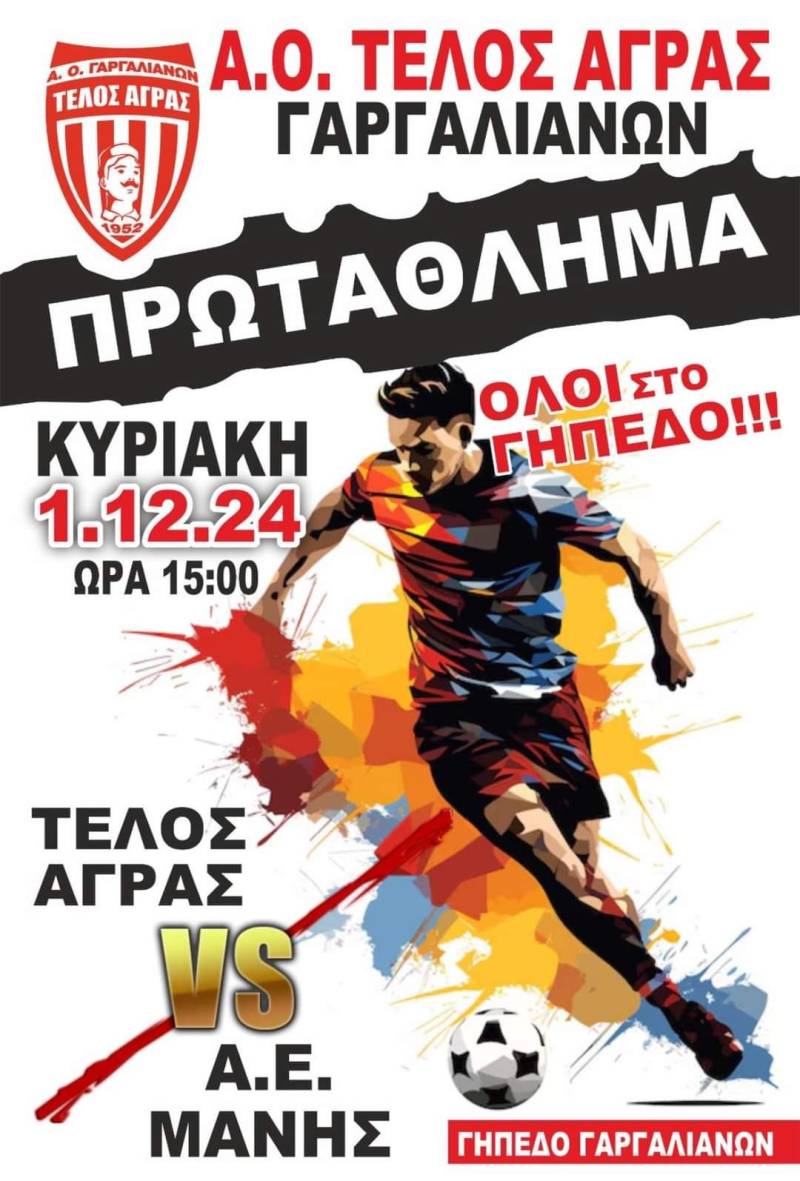 Ο Τέλλος Άγρας θα κοντραριστεί με την ΑΕ Μάνης με διαιτητή τον Κομπιλίρη και βοηθούς τους Γαϊτάνη και Θεοδωρίδη.
