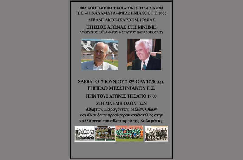 Σήμερα, Σάββατο 7 Ιουνίου στις 17:30, θα διεξαχθεί το καθιερωμένο φιλικό παιχνίδι ανάμεσα στους Παλαίμαχους του Μεσσηνιακού και της Καλαμάτας, σε ένα ξεχωριστό ποδοσφαιρικό ραντεβού με έντονο συμβολισμό και συγκίνηση.