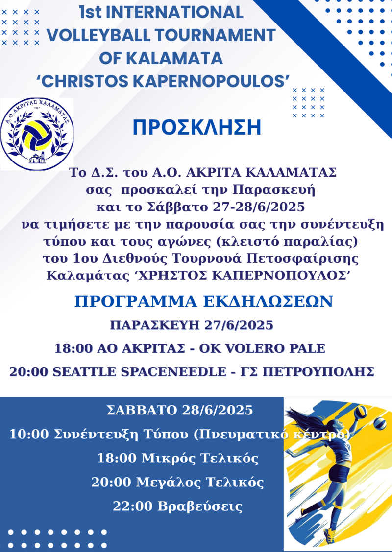 Το ΔΣ του ΑΟ ΑΚΡΙΤΑ προσκαλεί όλους τους ανθρώπους του αθλητισμού και όχι μόνο να τιμήσουν με την παρουσία τους τις εκδηλώσεις του τουρνουά ‘Χρηστος Καπερνόπουλος’ παίρνοντας μέρος σε μια μεγάλη και ιστορική στιγμή του Πελοποννησιακού βόλεϊ.