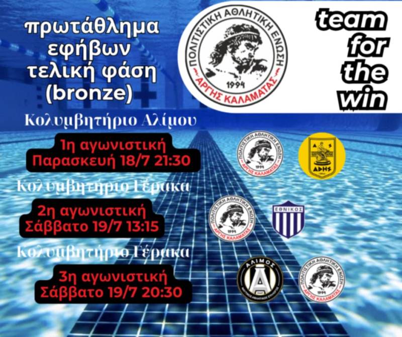 Το 3ημερο Παρασκευή 18/7 έως Κυριακή 20/7 θα διεξαχθεί στην Αθήνα η τελική φάση του πρωταθλήματος υδατοσφαίρισης εφήβων (Κ17) της bronze league. Οι αθλητές του Άργη Καλαμάτας κληρώθηκαν στον Ά όμιλο με τις ομάδες: ΑΣ Άρης Θεσ., Εθνικός ΟΦΠΦ, Άλιμος ΝΑΣ. Οι αγώνες του Ά ομίλου θα γίνουν την Παρασκευή 18/7 στο κολυμβητήριο του Αλίμου και το Σάββατο στο κολυμβητήριο του Γέρακα.