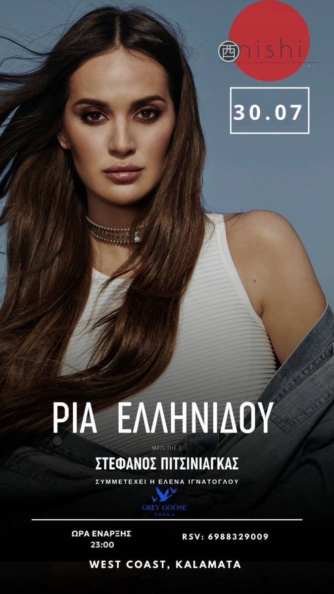 Η εκρηκτική Ρία Ελληνίδου έρχεται για μία μοναδική live εμφάνιση την Τετάρτη 30 Ιουλίου στο εντυπωσιακό Nishi στη δυτική παραλία της Καλαμάτας, υπόσχοντας να απογειώσει τη νύχτα με τη φωνή, την ενέργεια και τη σκηνική της παρουσία.