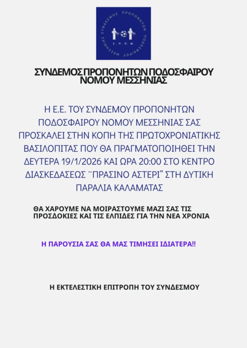 Ο Σύνδεσμος Προπονητών Ποδοσφαίρου Μεσσηνίας διοργανώνει τη Δευτέρα 19 Ιανουαρίου 2026 και ώρα 20:00 την καθιερωμένη εκδήλωση για την κοπή της πρωτοχρονιάτικης βασιλόπιτάς του.