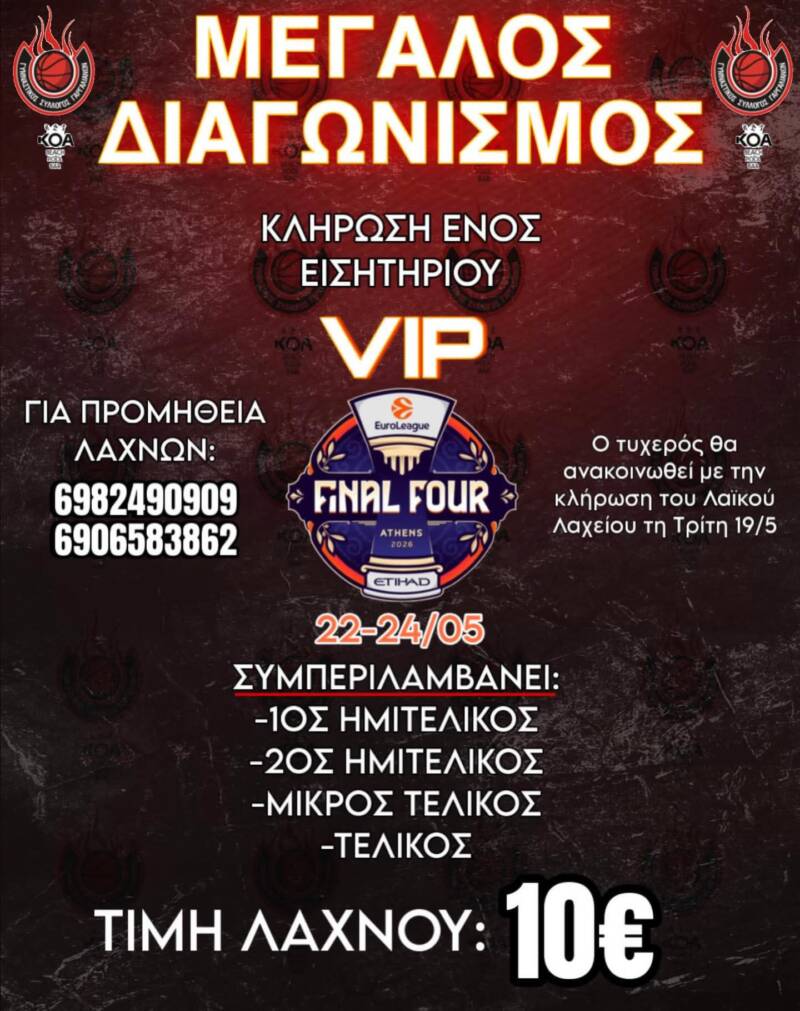 Έναν μεγάλο διαγωνισμό για τους φίλους του μπάσκετ διοργανώνει ο Γ.Σ. Γαργαλιάνων, προσφέροντας την ευκαιρία σε έναν τυχερό να ζήσει από κοντά τη μαγεία του EuroLeague Final Four 2026 που θα διεξαχθεί στο ΟΑΚΑ.