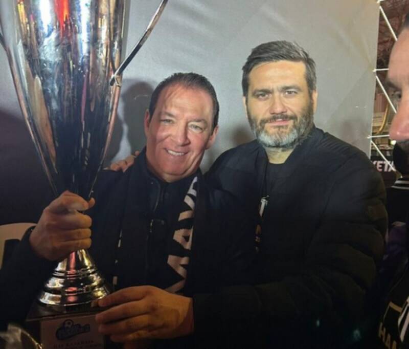 Η Καλαμάτα πανηγύρισε απολύτως δίκαια την κατάκτηση του πρωταθλήματος του Β’ ομίλου της Super League 2, με τον πρόεδρο Γιώργο Πρασσά να αποτελεί εγγύηση και μεγάλο υποστηρικτή όλης αυτής της προσπάθειας. Στο πλευρό του φυσικά, ο ποδοσφαιράνθρωπος Ευριπίδης Τσιμπανάκος, ο οποίος καρπώνεται σε μεγάλο βαθμό αυτή την επιτυχία. Είχε αφήσει κάτι στη μέση και επέστρεψε ώστε να το φέρει εις πέρας. Τα κατάφερε και πανηγυρίζει, στο φακό με το τρόπαιο του πρωταθλητή και τον Γιώργο Πρασσά στο πλάι του.