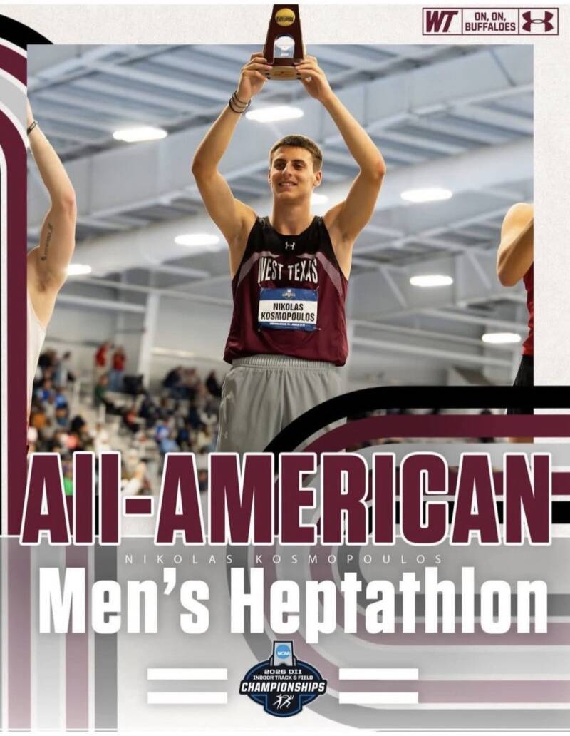 Μια σπουδαία επίδοση η οποία συνδυάστηκε με ένα μεγάλο Πανελλήνιο Ρεκόρ πραγματοποίησε ο ταλαντούχος αθλητής του Μεσσηνιακού Γ.Σ. 1888 και της Εθνικής Ομάδας Νίκος Κοσμόπουλος στο Έπταθλο της κατηγορίας Κ20. Ο Κοσμόπουλος συμμετείχε στο πρωτάθλημα κλειστού στίβου του NCAA DII στην Virginia Beach εκπροσωπώντας το Πανεπιστήμιο του West Texas A&M.