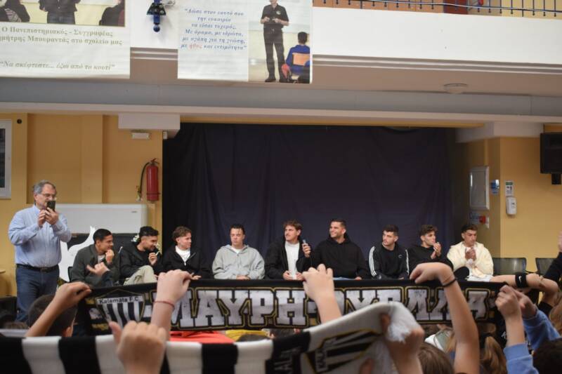 Οι ποδοσφαιριστές, εμφανώς χαρούμενοι και περήφανοι για την επιτυχία τους, μοιράστηκαν με τους μαθητές στιγμές από τη φετινή τους πορεία, αναφέρθηκαν στις προκλήσεις που αντιμετώπισαν και στάθηκαν στη σημασία της επίτευξης ενός τόσο μεγάλου στόχου για την ομάδα και την πόλη.