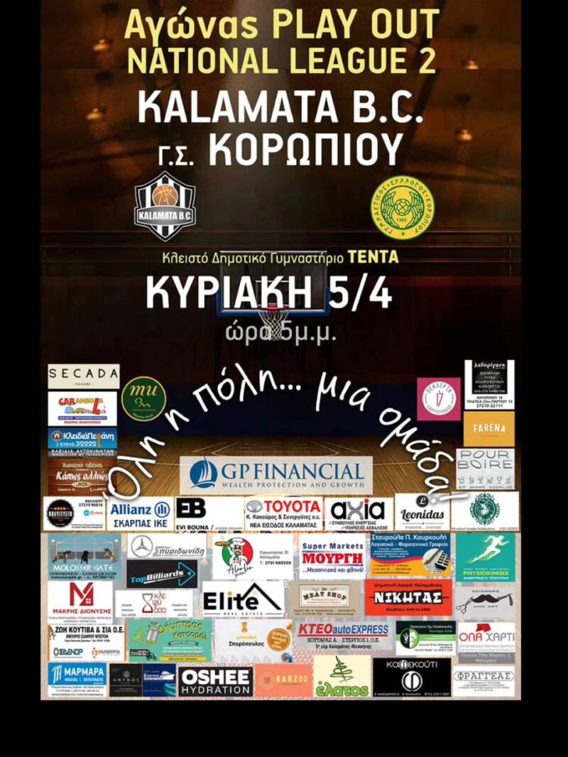 Σε ρυθμούς… τελικού κινείται η Kalamata BC, η οποία υποδέχεται σήμερα τον Γ.Σ. Κορωπίου στο κλειστό της «Τέντας» (17:00), σε μια αναμέτρηση δίχως αύριο για τα play out της National League 2.