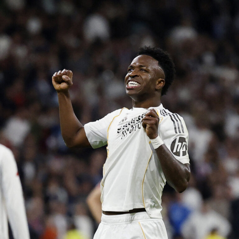 Soccer Football - LaLiga - Real Madrid v Atletico Madrid - Santiago Bernabeu, Madrid, Spain - March 22, 2026 Real Madrid's Vinicius Junior celebrates scoring their third goal REUTERS/Jon Nazca