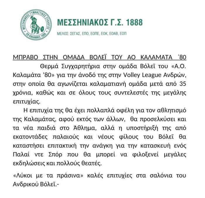ΜΕΣΣΗΝΙΑΚΟΣ: Θερμά συγχαρητήρια στην Καλαμάτα ’80