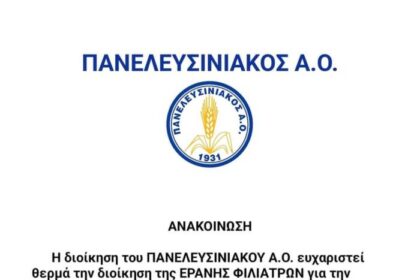 Ανακοίνωση εξέδωσε η διοίκηση του Πανελευσινιακού όπου ευχαριστεί την διοίκηση της Εράνης…